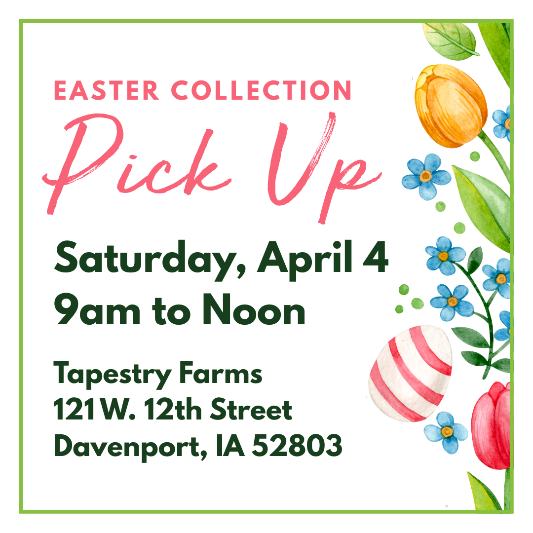 Order online and pick-up Saturday, April 4 from 9am to Noon at Tapestry Farms.